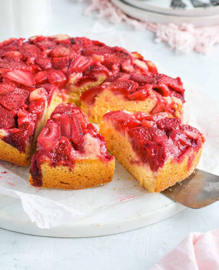 This elegant dessert layers caramelised, vibrant strawberries under a soft vanilla butter-cake, resulting in a stunning flip-topped treat that’s both romantic and effortless. With sweet berries sitting at the base of the pan and then becoming the cake’s showpiece once inverted, it brings eye-catching visual appeal without overly complex technique.