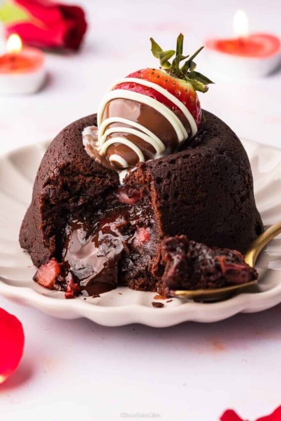 These individual molten-centre cakes are tailor-made for Valentine’s date night: crisp outer shells, warm, oozing chocolate interiors, and chopped strawberries throughout. With just two ramekins needed, they feel intimate yet indulgent.