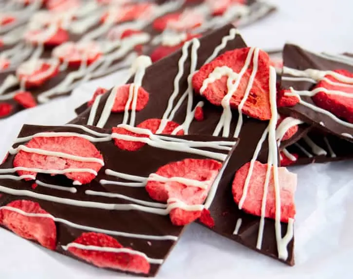 For a simpler, yet still festive Valentine’s treat: breakable shards of chocolate bark studded with dried or fresh strawberries and perhaps a sprinkle of pink-hued toppings. It’s casual, yet looks beautifully homemade and upscale, a perfect dessert for sharing, packaging as a gift, or pairing with coffee after dinner.