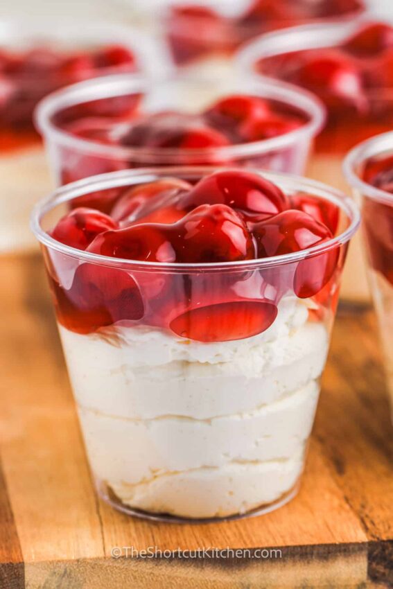 The mixture gets piped or spooned into small cups or bowls, then chilled until firm. From there, you can top each cup with cherry, blueberry, lemon, or apple pie filling, or set up a DIY topping bar with fruit, crushed cookies, and chocolate sauce so guests can customize their own dessert.