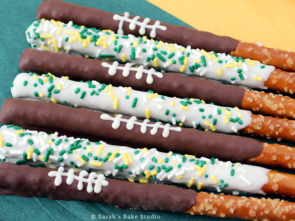 You can also dip some in white chocolate and cover them with sprinkles in your team colors to fill out the platter. The sweet and salty combo is perfect for snacking between plays, and because they are long and sturdy, guests can grab one as they move around the room without any crumbs or sticky fingers.