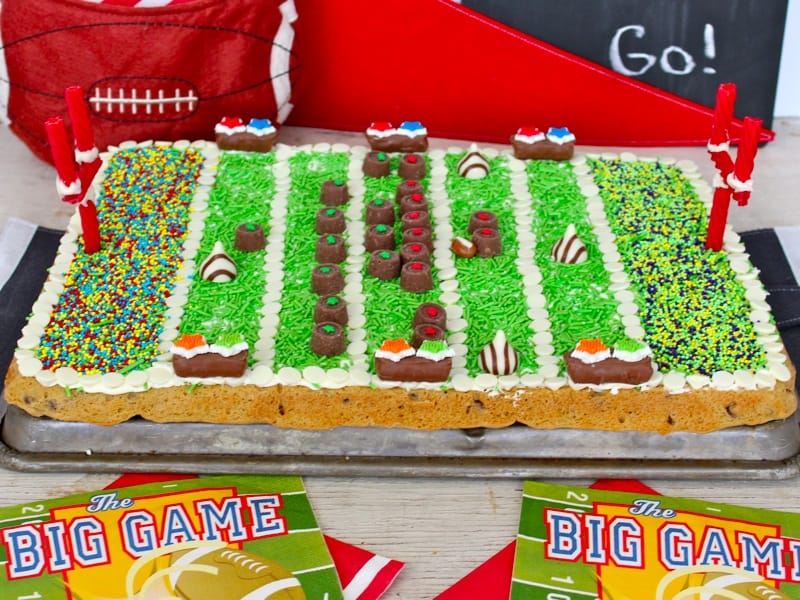 The result looks like a little edible stadium that kids and adults will both be excited to slice into. Because it is baked in an 18-by-13-inch pan, you get plenty of servings for a big Super Bowl gathering, and cutting smaller squares means everyone can snag a piece even after piling their plates with wings and dips.