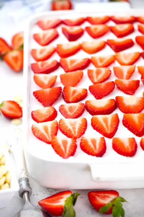 This strawberry poke cake is the fruity, chilled dessert your Super Bowl table needs after all the salty snacks and spicy wings. It starts with an easy white cake baked in a 9 by 13 pan, then you poke it all over and soak it with a rich white chocolate strawberry sauce so every bite is extra moist and flavorful.