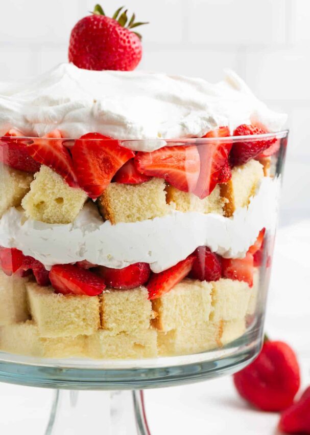 This strawberry shortcake trifle is a great way to add something light and fresh to a Super Bowl dessert spread that is full of chocolate and peanut butter. Cubes of buttery pound cake are layered in a big trifle dish with clouds of sweet stabilized whipped cream and plenty of fresh, juicy strawberries for color and flavor.