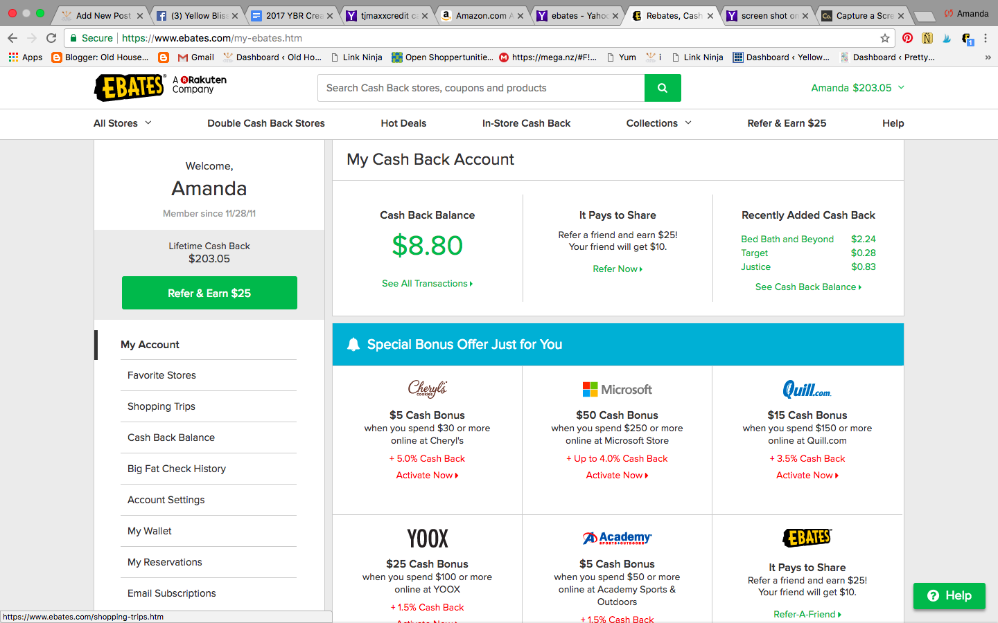 Ebates will keep track of your shopping trip and will keep a wallet of the money you’ve accumulated. A few times of a year, the balance gets transferred to your PayPal account. I am attaching an actual screen shot from my computer so you can see I really use it! Check out that lifetime cash back amount, $203!! Sign up for Ebates here!