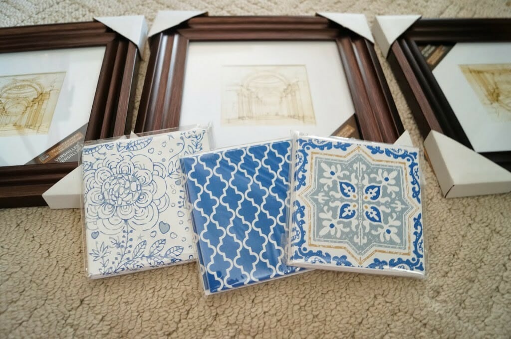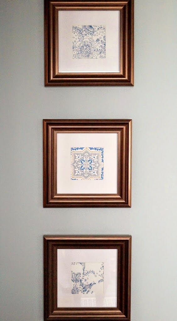 Sometimes I wander aimlessly though Michael’s, never finding what I’m looking for. Not this time. I walked past the dollar bins and these note cards reached out and smacked me! They were blue and yellow, exactly the colors I was looking for, and were a cute square shape that I thought would look great in a matted frame. I also love how they coordinate, but not match.
