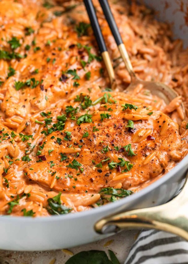 Baby spinach wilts into the pan near the end, adding color and a bit of freshness to balance the richness. The orzo absorbs the sauce, so you get tender pasta, juicy chicken and a silky, tomato-kissed coating in every forkful.