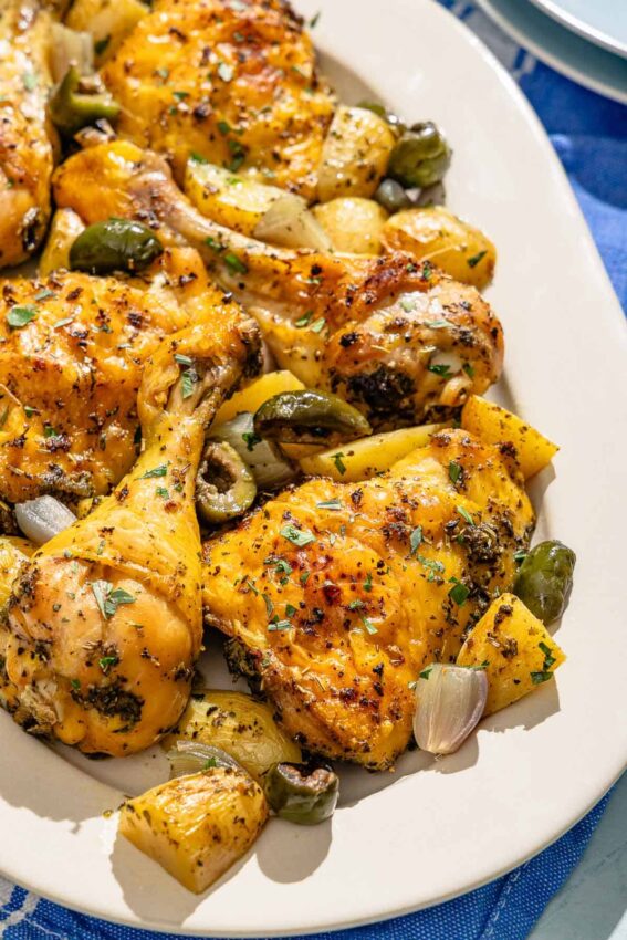 This sheet pan chicken and potatoes with olives brings French Mediterranean flair to Valentines with almost no fuss. Bone-in chicken pieces roast alongside potatoes and shallots in a lemon and olive oil marinade scented with herbes de Provence and garlic.