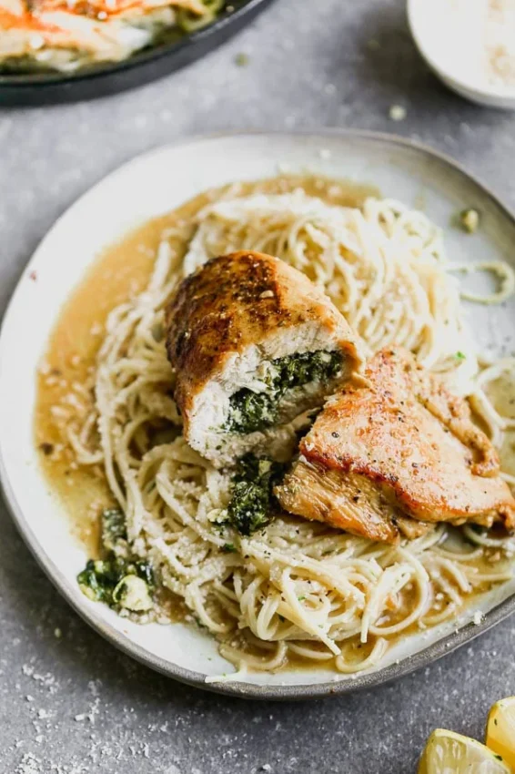 This recipe feels more “date night restaurant” than weeknight basic, yet it stays very doable for home cooks. Make the filling and stuff the chicken earlier in the day, then sear and bake just before dinner. Slice the chicken on a board, spoon over the pan sauce, and serve with extra lemon wedges.