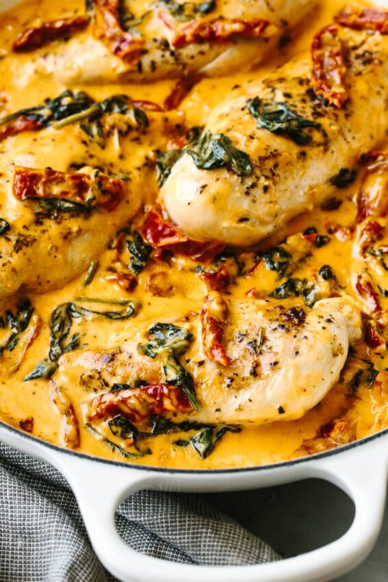 Creamy Tuscan chicken gives you all the romance of an Italian bistro at home. Juicy chicken breasts are seasoned with Italian herbs, seared until golden, then nestled into a luxurious cream sauce with Parmesan, sun-dried tomatoes, onion, garlic, and plenty of wilted spinach.