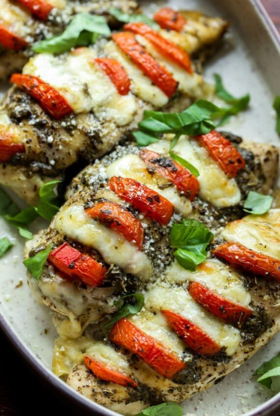 On the plate, you get melty cheese, sweet roasted tomatoes, and herby pesto in every bite, all on a juicy chicken base. The colors pop, so it looks extra festive for Valentine dinner without much extra work.