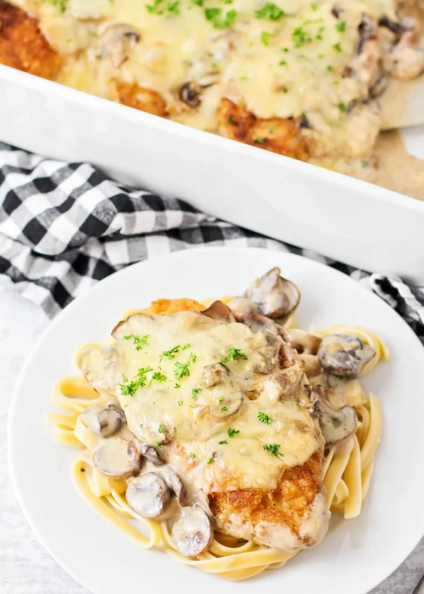 This chicken and mushrooms recipe is pure comfort food, perfect for a laid-back Valentine’s dinner at home. Crispy breaded chicken breasts bake in a creamy mushroom sauce made with sautéed mushrooms, garlic, cream of mushroom soup, and chicken broth, then finish under a blanket of melted Swiss cheese.