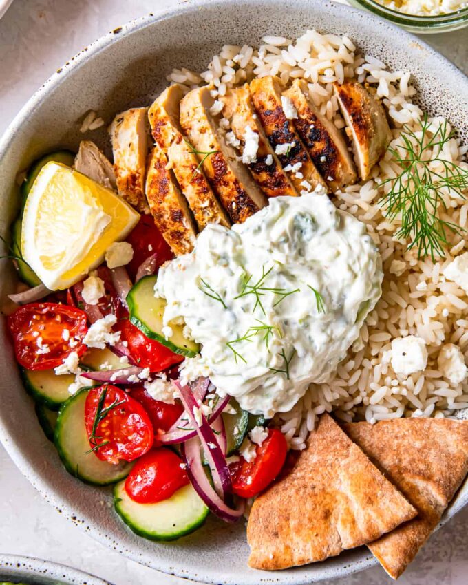 If you prefer fresher, lighter flavors for Valentines, this chicken tzatziki bowl is a great pick. Chicken marinates in a simple yogurt-based mix with lemon, garlic, and herbs, then cooks in a skillet until golden and juicy.