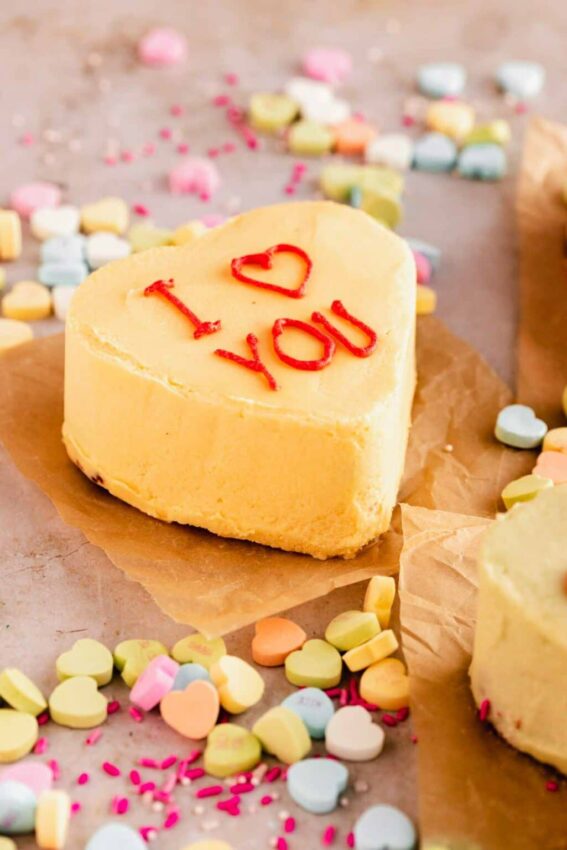 The real magic is on top, where you can write classic conversation heart messages or funny anti-Valentine’s phrases in bright red icing. They are just the right size to tuck into a little box for gifting or to serve one per person after a romantic dinner.
