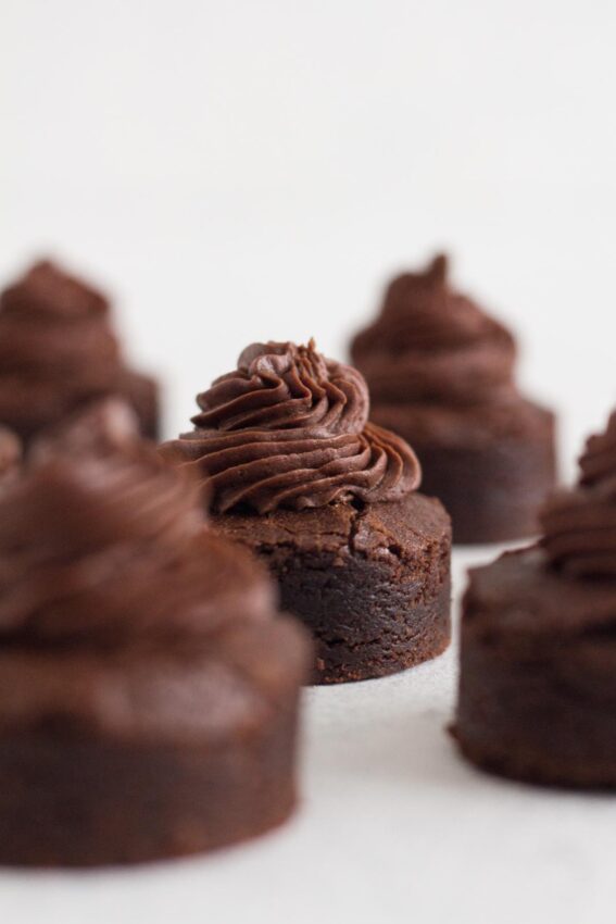 These brownie bites with whipped chocolate ganache are for true chocolate people. Fudgy, from-scratch brownie batter bakes in a mini muffin pan until the tops are shiny and the centers stay extra moist. Once cool, you crown each bite with a swirl of whipped chocolate ganache that tastes like a cross between mousse and frosting.