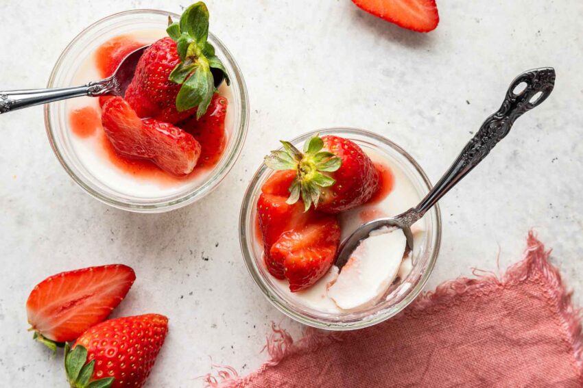 You pour it into small ramekins or glasses, chill for a few hours, then finish with fresh strawberries or a quick berry sauce.