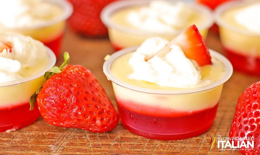 A separate strawberry Jello layer sets in the bottom of each small cup, so you get a bright, wiggly base under the pale cheesecake pudding. After everything chills for a few hours, you top the shots with whipped cream, crushed graham crackers, and fresh strawberries, so they look like tiny strawberry cheesecakes in shot form.