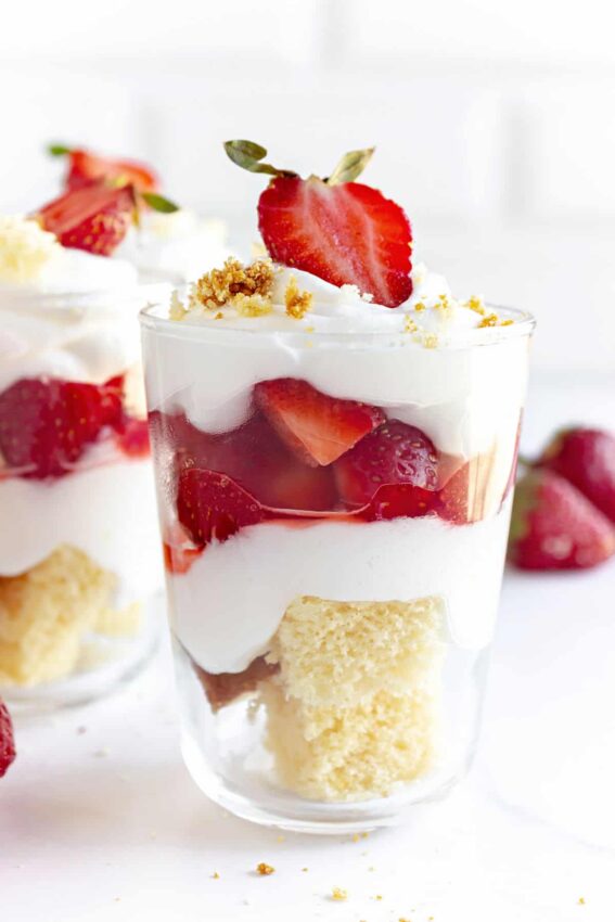 You build the trifles in individual jars or glasses, starting with sturdy cake, then spooning on whipped cream, strawberry sauce, and diced strawberries. Repeat the layers so the colors show through the sides. Everything rests in the fridge for several hours, which lets the cake soften and the flavors blend.